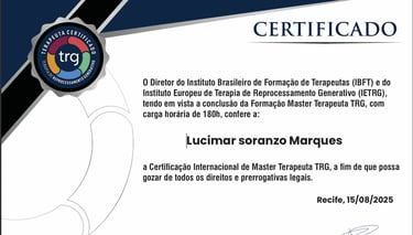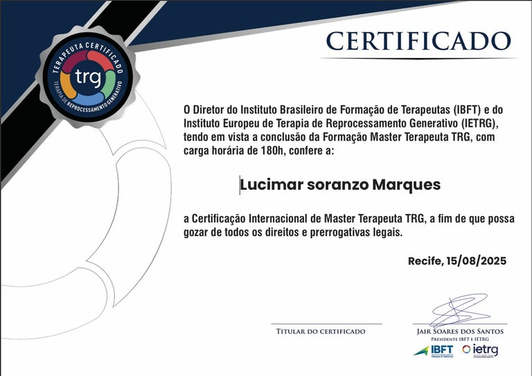 Sou terapeuta especializada em TRG — Terapia de Reprocessamento Generativo, uma abordagem profunda e eficaz voltada para o tratamento de traumas e desequilíbrios emocionais. A TRG atua não apenas nos sintomas, mas nas raízes invisíveis que sustentam padrões disfuncionais e experiências dolorosas.